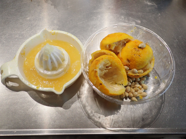 無農薬なので見た目は少し悪いですが 皮も安心して食べることができます。 皮をおろし金ですりおろします。 果汁を絞ります。 白味噌を使います。 果汁に砂糖を溶かし白味噌を入れてゆっくり 照りが出るまで加熱すると柚子味噌の完成です。 柚子蜜の果汁は濾して使います。 蜂蜜と白砂糖を使います。 果汁に白砂糖を溶かしてから 蜂蜜をいれて加熱します。 柚子味噌と柚子蜜を作った後に果肉で柚子ジャムを作り、 種子はホワイトリカーに漬け込むと柚子化粧水になります。 皮は砂糖で発酵させてビールにすると捨てるものはありません。 柚子味噌は香りが良くふろふき大根や味噌田楽に使います。 ゆず蜜はスピリッツに入れたり、チューハイを作ったりします。 |